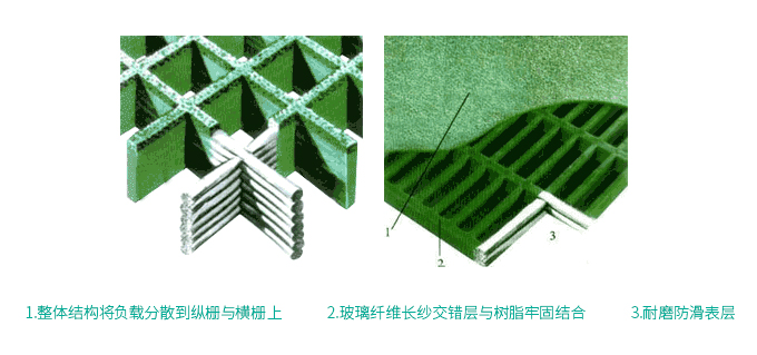 其頂端具有硅質(zhì)磨粒的防滑層,內(nèi)在交錯編制結(jié)構(gòu),整體成型將負載分布在縱向柵條和橫向柵條上,使之具有較高的強度和負載能力。